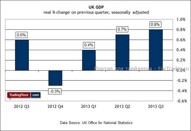 Великобритания может похвастаться «самой устойчивой экономикой среди развитых стран мира», заявил вчера председатель Банка Англии Марк Карни, выступая перед Комитетом Казначейства в парламенте. «Экономика стремительно растет, ежемесячно создается 60 000 рабочих мест. На лицо повышение уровня доверия в деловой среде», — сказал он. Ожидается, что сегодняшняя публикация второй редакции оценки ВВП за третий квартал подтвердил такую благоприятную тенденцию. Консенсус-прогноз предусматривает достойный рост на 0,8% по сравнению со вторым кварталом, что совпадает с первоначальной оценкой темпов роста, опубликованной в конце прошлого месяца.