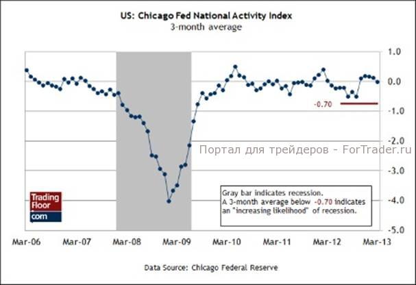 Этот показатель бизнес-цикла — единственный, публикуемый сегодня индекс по США, поэтому он привлечет к себе немало внимания. Последние данные по CFNAI свидетельствуют о том, что угроза рецессии ушла на второй план. В мартовском отчете, трехмесячное среднее значение индекса составило -0,01, что намного выше опасной зоны -0,70.