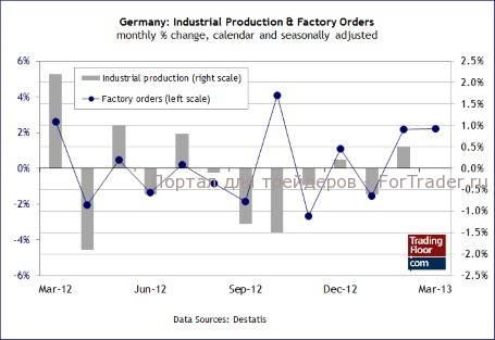 В сегодняшнем отчете о промышленном производстве за март игроки снова будут искать признаки того, что экономика Германии стабилизируется после временного ослабления. Такие ожидания напрямую связаны с тем, что вчера заводские заказы продемонстрировали рост в размере свыше 2% второй месяц подряд. «Результаты стали настоящим сюрпризом», − заявил экономист Deutsche Postbank агентству Bloomberg. «Они дают основание надеяться не только на то, что промышленность Германии восстановится после спада, но и что вся экономика еврозоны находится на пороге восстановления, пусть и незначительного». В этом случае сегодняшний отчет о промышленном производстве должен как минимум показать умеренные темпы роста.