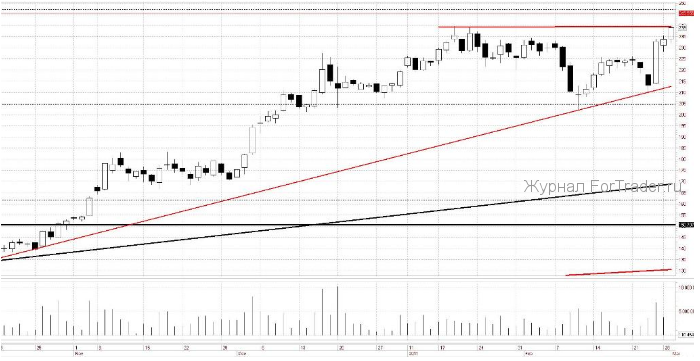 Рассмотрим акции Уралкалия с позиции технического анализа. С октября прошлого года котировки торгуются по линии восходящего тренда, который на текущий момент проходит в районе 213 р. В конце февраля покупатели в очередной раз подтвердили силу тренда, отжавшись от него во второй раз за месяц. Сейчас основным сопротивлением выступает уровень на 240 р., под которым как раз сейчас акции и торгуются. В случае пробоя покупатели будут стремиться к уровню на 250 р., прикрыв заодно открытый геп от 19.08.2008 г. Также, в районе 250 р. проходит уровень коррекции 61,8% по Фибоначчи от глобального снижения.