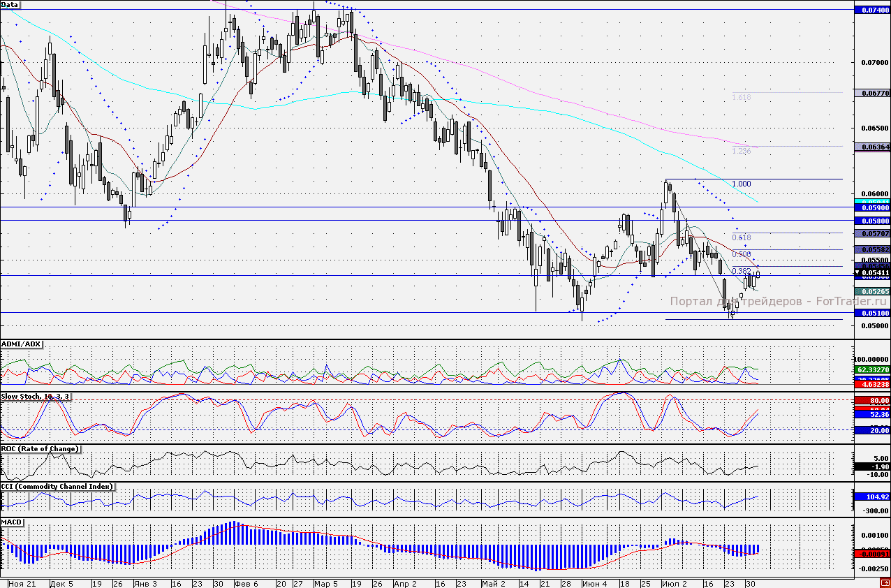 Акции ВТБ сегодня тестируют 21-дневную скользящую среднюю (5,44 коп.), при поступлении позитивных сообщений бумаги могут с легкостью преодолеть данную отметку. Индикатор ADMI/ADX показывает, что силы «быков» по бумагам преобладают (линия «быков» находится выше линии «медведей»), при этом линия %K осциллятора медленный Stochastic (10;3;3) находится выше линии %D, что может свидетельствовать о продолжении восходящей динамики акций. Таким образом, рекомендую наращивать длинные позиции при закреплении акций выше 5,44 коп. Однако, в случае формирования негативных настроений, бумаги могут откатиться к ближайшей поддержке 5,27 коп., в районе которой проходит 10-дневная скользящая средняя. Наш торговый робот находится в «лонгах», удерживая длинные позиции от отметки 5,32 коп.