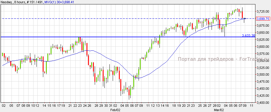 Уолл-стрит завершила торговый день смешано после выхода количества рабочих мест в несельскохозяйственном секторе с показателем 175 тыс против 151 тыс. S&P 500 вырос на 0.05%, NASDAQ упал на 0.47%, а Dow Jones вырос на 0.19%. Согласно техническому анализу 8-часового графика, NASDAQ торгуется возле рекордного максимума. Пока индекс торгуется выше уровня поддержки 3,633, импульс остается восходящим, и может достичь следующего уровня сопротивления 3,730.