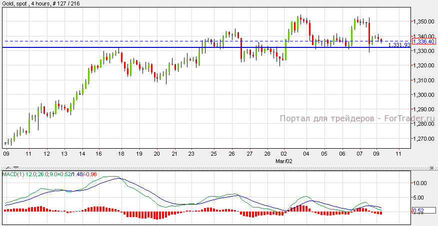 Золото подешевело на 0.73%, составив $1,340 за унцию. Согласно техническому анализу 4-часового графика, золото торгуется с восходящим импульсом. Задержка выше уровня поддержки 1,331 вновь приведет золото к отметке 1,345. Тем не менее, прорыв ниже уровня поддержки вызовет снижение к следующему уровню поддержки 1,321. Индикатор MACD находится выше 0 и так же поддерживает восходящий тренд.
