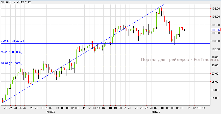 Нефть подорожала на 0.82% составив $102.64 за баррель. Согласно техническому анализу 8-часового графика, задежка выше уровня поддержки 100.70 — который совпал с 38.20%-ным уровнем коррекции Фибоначчи — вновь приведет нефть к отметке 105. Однако, импульс ниже уровня поддержки вызовет снижение нефти к следующему уровню поддержки 99.30 — который совпал с 50.00%- ным уровнем коррекции Фибоначчи.
