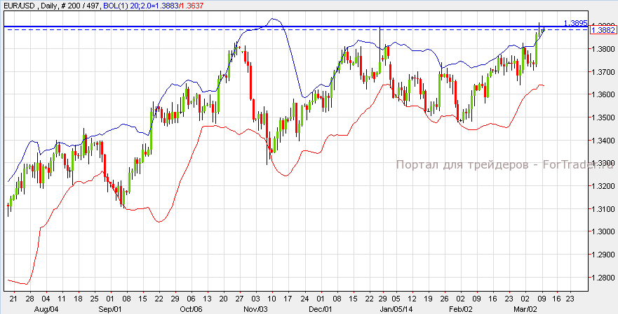 Евро вырос против доллара США после выхода отчёта по промышленному производству в Германии, который вышел лучше прогнозов и составил 0.8% против 0.7%. Согласно техническому анализу дневного графика, пара EUR/USD сформировала фигуру «двойная вершина». Если пара не сможет пробить уровень сопротивления 1.3895, она может вновь упасть к отметке 1.3700. Пара также коснулась верхней полосы Боллинджера, что указывает на возможное падение к нижней полосе.