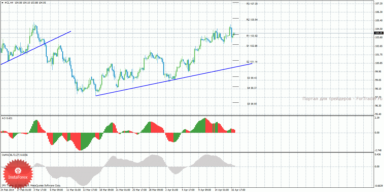 Анализ сырой нефти за 17 апреля показывает, что цена закрепилась выше уровня сопротивления R1 и может продолжить восходящий тренд. Восходящее движение может продолжиться с целями R2 – 105,64 и R3 – 107,35, если цена останется выше уровня 103,92. Может начаться нисходящая коррекция с целями 102,86 и 101,14, в случае, если цена закрепится ниже уровня 103,92. Восходящая линия тренда перестроена и вновь поддерживает торгующих на повышение. Индикатор Awesome показывает текущее нисходящее движение, так как последний закрытый бар красного цвета. OsMA также направлен вниз, что говорит о нисходящем характере движения и в более долгосрочном плане. Отскок цены от уровня 105,64 также может спровоцировать новый виток коррекционного движения.