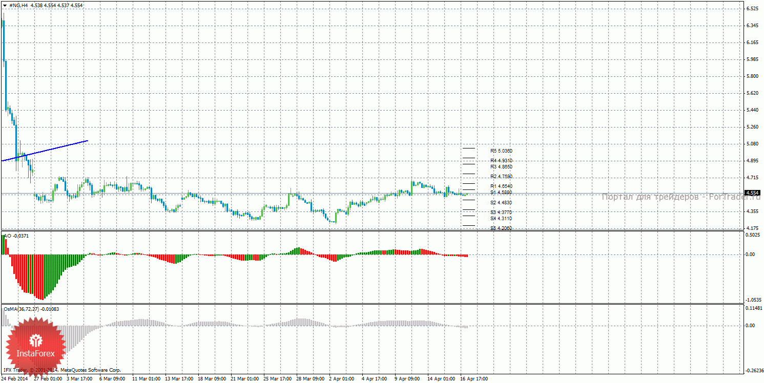 Анализ природного газа за 17 апреля показывает, что цена продолжает слабое движение, сейчас с нисходящим уклоном, оба индикатора по-прежнему находятся около нулевых уровней. На данный момент актуально нисходящее движение с целями уровни поддержки S2 – 4,4830 и S3 – 4,3770, если цена останется ниже уровня 4,5880. Целями для возможного начала восходящей коррекции выступают уровни сопротивления 4,6540 и 4,7590, если цена закрепится выше 4,5880. Цена закрепилась ниже восходящей линии тренда, поэтому она более не актуальна, тенденция на рынке поменялась на нисходящую. Нисходящая линия тренда отсутствует. Индикатор Awesome показывает локальное нисходящее движение, последний закрытый бар окрашен в красный цвет. OsMA также направлен вниз, что сигнализирует о нисходящем движении цены на газ и в более долгосрочной перспективе. Сейчас по-прежнему не самая благоприятная ситуация для открытия позиций.