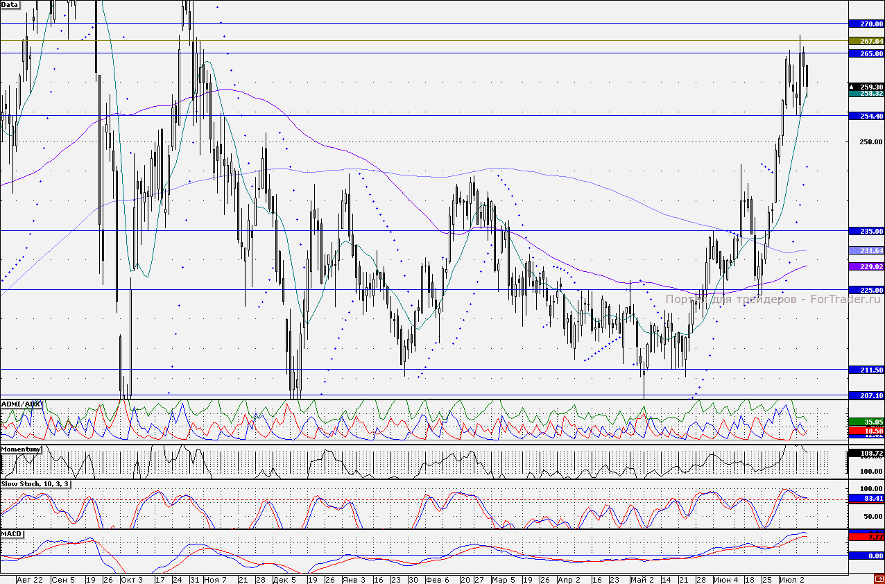 Акции «Уралкалия» сегодня не удержали отметку 258,10 руб., где проходит 10-дневная скользящая средняя. При сохранении негативных настроений следующей целью для продолжения нисходящего движения выступит отметка 254,40 руб. (на часовом графике нижняя граница боковика). Судя по техническим сигналам, продолжение нисходящего движения наиболее вероятно. График осциллятора Momentum направлен вниз, при этом линия %К осциллятора медленный Stochastic (10,3,3) находится ниже линии %D, что может свидетельствовать о продолжении нисходящей динамики акций. Наш торговый робот открыл короткие позиции по бумагам от отметки 262,81 руб. и пока удерживает их. Таким образом, рекомендую удерживать короткие позиции по бумагам с ближайшей целью 254,40 руб.