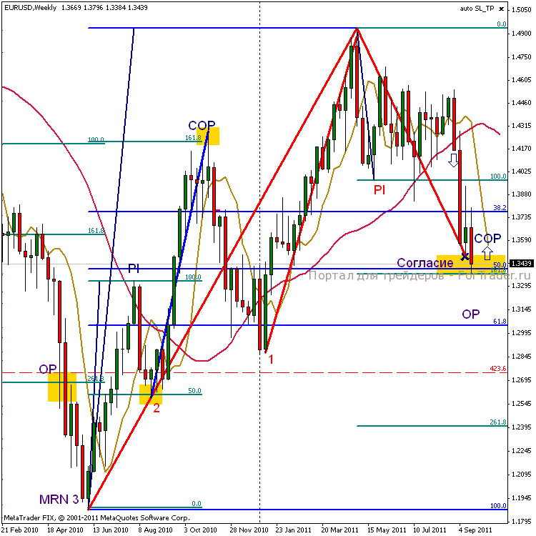 EUR. После резкого снижения стоимости единой валюты в начале августа и последующей некоторой стабилизации котировок на уровне Фибоначчи 61,8% от восходящего импульса первой половины года (1), падение на минувшей неделе возобновилось с новой силой. Тем не менее, уже на текущий момент была достигнута важная зона поддержки Согласие, образуемая 50%-ой коррекцией Главного Номера Реакции (MRN 3, см. условные обозначения), а также уровнем фибо-расширения 161,8% от первого нисходящего размаха (PI июня). Обе DMA подтверждают нисходящую тенденцию.