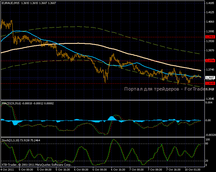 На 15-ти минутном графике сильная нисходящая тенденция, линии МА параллельны и направлены вниз. У линии MACD уже не хватает силы покинуть отрицательную зону. Наиболее вероятным сценарием развития торговли будет продолжение снижения цены ниже отметки 1,3650.