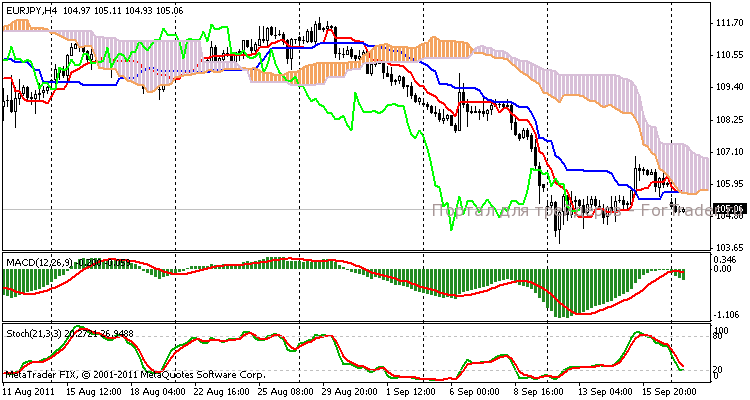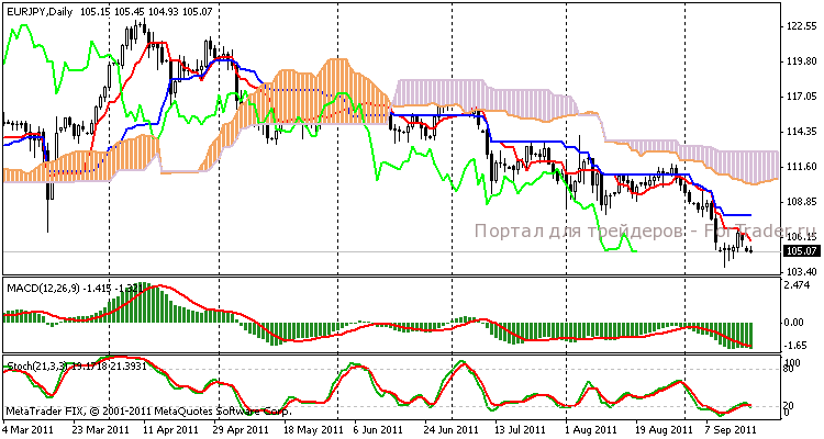 На дневке участники торгов не смогли пробить линию Tenkan-sen и отскочили от нее вниз. На текущий момент отмечается вероятность появления усиливающегося нисходящего импульса.