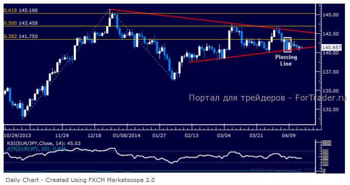 Японская иена выросла против евро после повышения котировок EUR/JPY. Пара продолжает торговаться выше уровня поддержки, установленного с середины февраля. Однако вчера наблюдалось прохождение сопротивления 141,75 с дальнейшим расширением диапазона колебаний до нового максимума 142,73. Тем временем, поддержка находится на отметке 140,50. Образовавшаяся на дневном графике фигура свидетельствует о неопределенной перспективе колебаний в краткосрочном периоде.