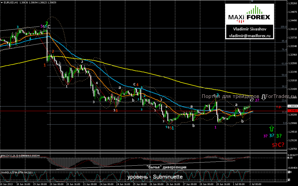 Курс единой валюты по отношению к доллару США, вновь, вырос на торгах в понедельник на фоне позитивных экономических новостей из Еврозоны. Индекс деловой активности в промышленной сфере региона оказался на максимуме, за последние 16 месяцев. Лучше ожиданий оказался и Уровень безработицы в Еврозоне, составивший в мае 2013 года – 12.1%, при прогнозном значении – 12.3%. Дополнительную поддержку единой валюте оказало также и заявление вице-президента Европейской комиссии Олли Рена, по словам которого, программа ЕЦБ по выкупу облигаций проблемных стран и Европейский механизм стабильности — помогли обеспечить финансовую устойчивость и сократить риски распада Еврозоны. Всё это позволило «быкам» по евро, вновь, развернуть валюту на коррекцию и достичь, на исходе торгов, уровня 1.3066.
