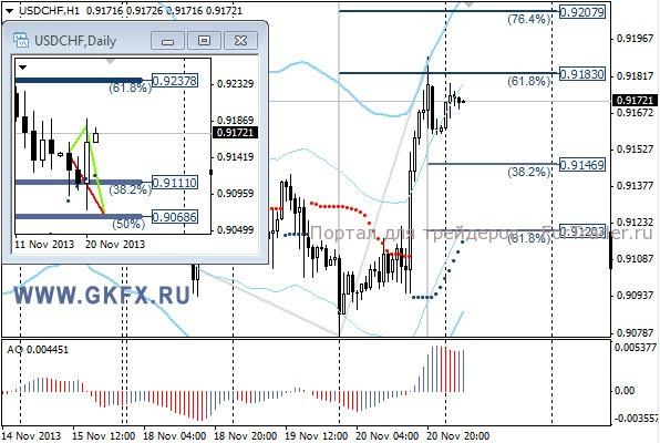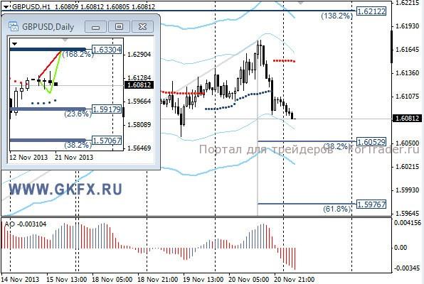 Пара EURUSD резко снизилась еще до публикации протоколов последнего заседания ФРС, и после публикации продолжила снижение. Перед публикацией протоколов выступил Президент ФРС-Сен-Луис Джеймс Буллард, который заявил, что на декабрьском заседании будет обсуждаться вопрос сокращения QE3. По сути, он рассказал, то чего ожидал рынок от протоколов заседания ФРС, а протоколы подтвердили ранее сказанное. Доллар направился в рост на ожиданиях сокращения QE3 на декабрьском заседании, и усилить эти ожидания смогут данные по рынку труда в США, которые будут представлены через две недели. По рекомендации сделка не исполнилась. На эту неделю традиционно рассматриваю два варианта возможного движения цены, основной красный и альтернативный зеленый. Значимые уровни на сегодня отмечены на часовом графике. Индикатор АО находится в отрицательной зоне и растет, указывая на коррекцию перед возможным продолжением снижения. Индикатор тренда указывает на снижение. Вне рынка.