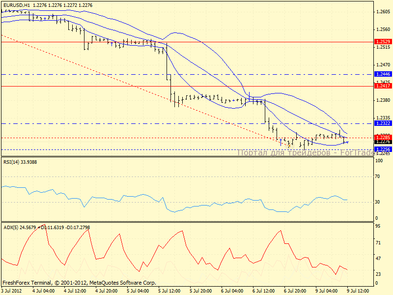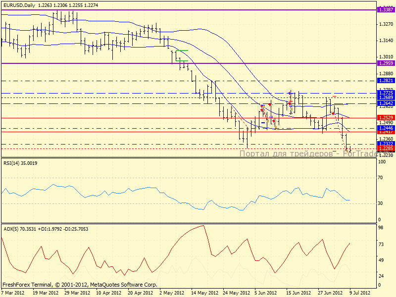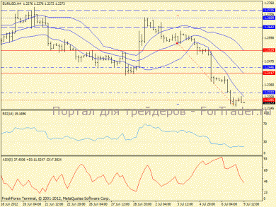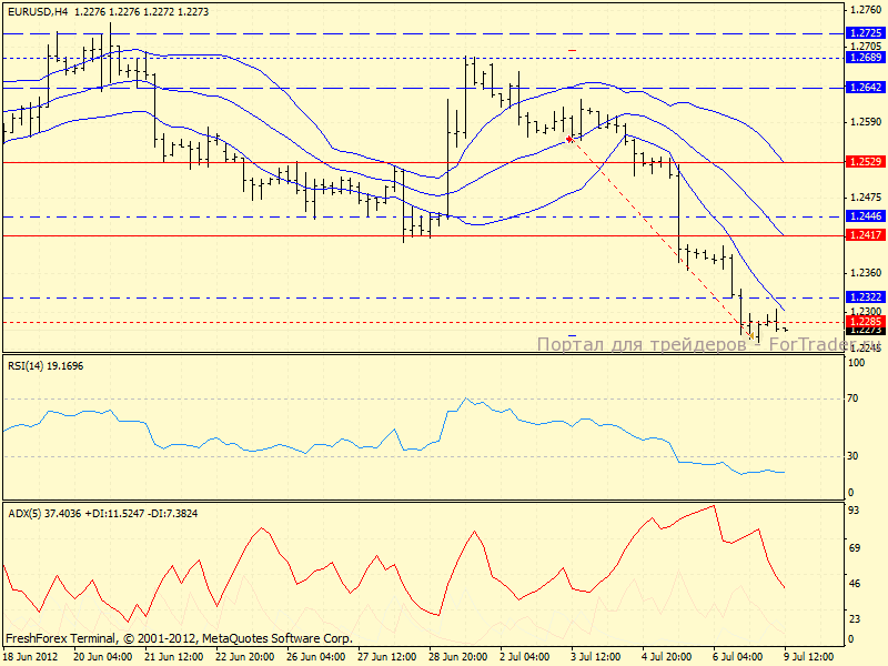 Н4: чрезвычайная перепроданность и характерный для разворота маневр от связки ADX/RSI. Но нисходящий тренд безупречен, и нижняя полоса Боллинджера породила новый пинообразный бар, подтверждающий, что самоубийц (покупателей дна) найти пока проблематично. Надежды быков на разворот в зиготообразном состоянии пульсируют в районе 1.2322.