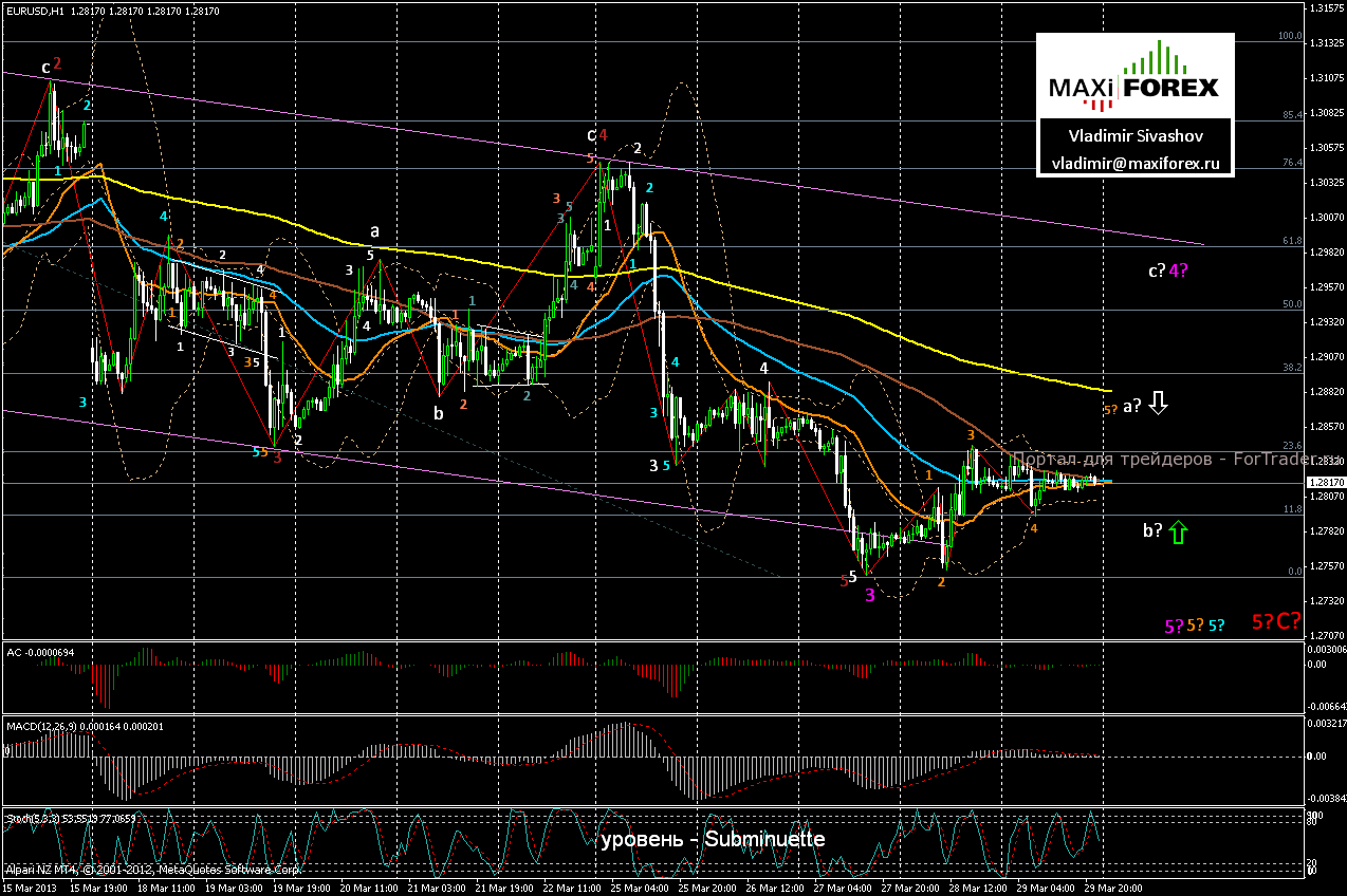 Закрытые (по поводу «Страстной пятницы») валютные рынки Европы и США буквально, остановили торговлю. В связи с отсутствием ведущих игроков, ликвидность торгов и волатильность ценового движения — оставались крайне низкими. К тому же, никаких значимых экономических новостей, на этот день, запланировано не было. По Кипру — ничего нового не известно, а в Италии полномочия по формированию правительства, после неудачной попытки образования коалиции, вновь, вернули президенту страны. На этом фоне, ключевые валютные пары, в течение всего дня, практически, не покидали 25-пунктовых диапазонов. Евро/доллар всю дневную торговую сессию колебался в пределах 1.2810 ÷ 1.2834. Учитывая, что в понедельник европейские рынки, по-прежнему, будут закрыты («пасхальный понедельник»), мы не ожидаем усиления рыночной активности, вплоть, до начала американской сессии.