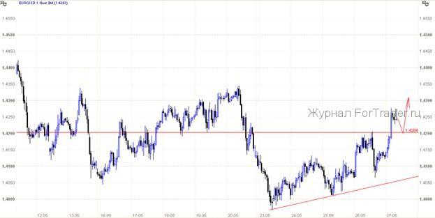 С технической стороны, ожидание продолжения восходящего движения евро с тестированием уровня 1,4300.