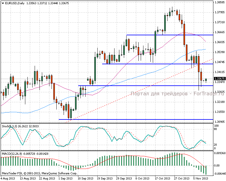 В пятницу был опубликован очередной отчет по рынку труда США. Число новых рабочих мест вне сельскохозяйственного сектора в октябре составило 204 тыс. (прогноз +125 тыс.). По результатам пересмотра за август и сентябрь, в общей сложности показатель добавил еще 60 тыс. Хороший отчет по рынку труда оказал поддержку американскому доллару. Пара EUR/USD достигла в пятницу минимума 1,3317, после чего последовал возврат цены. Индикатор MACD уверенно указывает на падение. Стохастик вышел из зоны перепроданности.