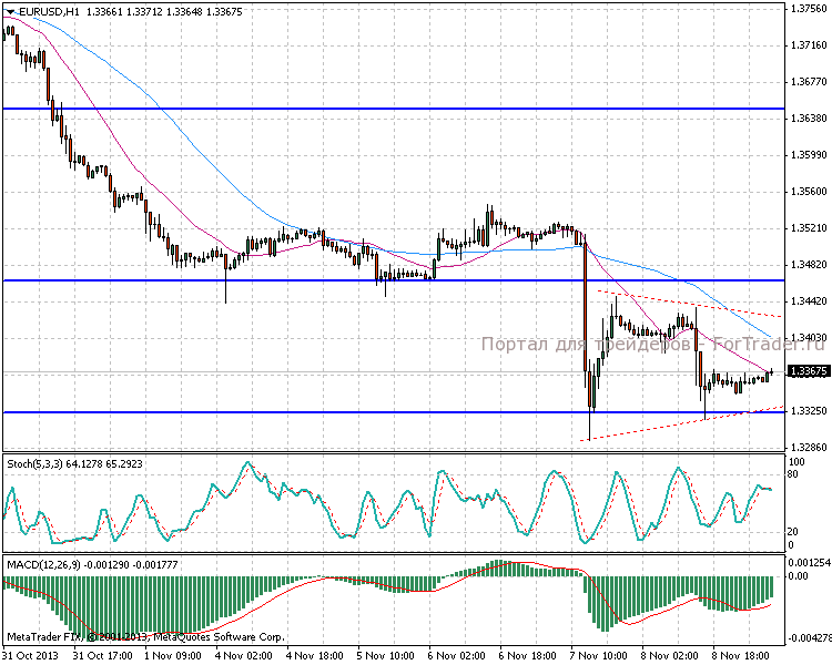 На часовом таймфрейме видим формирование треугольной формации после резкого падения 7.11.13, вызванного снижением процентной ставки со стороны ЕЦБ. Тренд остается нисходящий, SМА20 расположена ниже SМА50, поэтому рекомендуем, в первую очередь, рассматривать короткие позиции. При пробое нижней границы треугольного флета ожидаем дальнейшее снижение курса евро до 1,3150-1,3100.