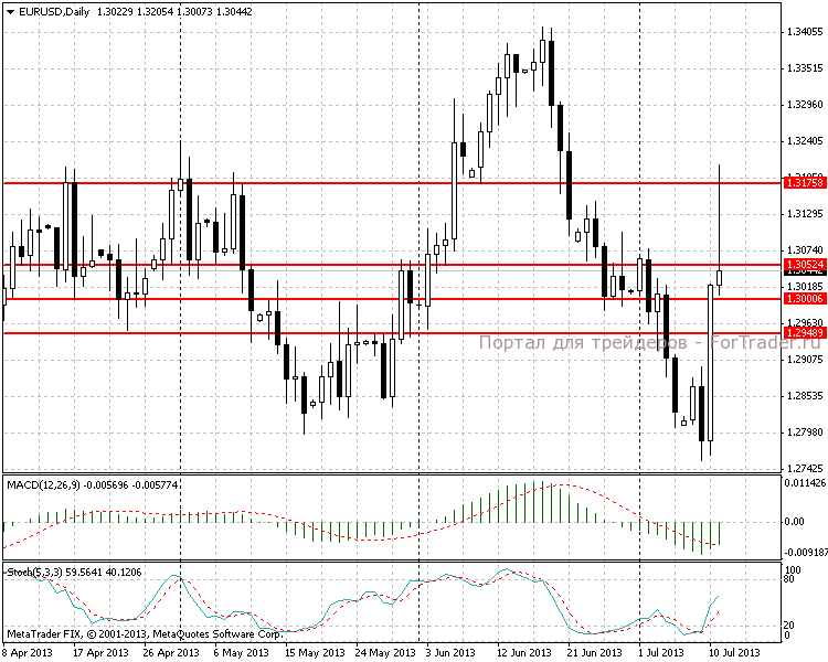 Бернанке отметил, что уровень безработицы в стране по-прежнему слишком высокий, а инфляция низкая, поэтому ФРС в обозримом будущем планирует продолжить стимулирующую политику в прежнем объеме. Повышение основной процентной ставки, вероятно, не состоится, пока уровень безработицы продолжает оставаться выше 6,5%. Эмоциональная речь председателя ФРС привела к росту курса евро относительно доллара на 360 пунктов. Цена дошла до ключевой области сопротивления 1,3175-1,3200, после чего началась коррекция. Взрывной рост цены привел к развороту MACD-гистограммы, которая уже пересекла свою сигнальную линию, тем самым подтвердив разворот тренда.
