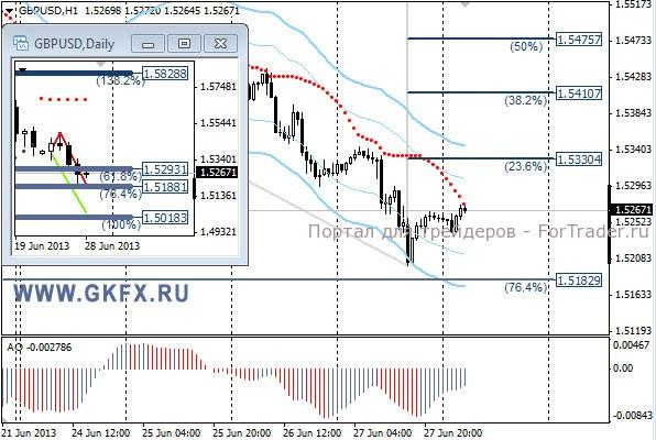 Пара EURUSD удержалась на текущих уровнях за счет кросс-курсов, когда другие валюты против доллара снижались. Кто-то не хочет видеть пару ниже 1,3000. Возможно, это связано с опционами. Если это так, то по окончанию июня можно будет наблюдать резкое снижение пары. Пока же пару крепко держат за пятую точку и ожидаемого снижения похоже на этой неделе не увидеть. На эту неделю традиционно рассматриваю два варианта возможного движения цены, основной красный и альтернативный зеленый. Значимые уровни на сегодня отмечены на часовом графике. Индикатор АО находится в положительной  зоне и растет, указывая на желание пары двигаться вверх. Индикатор тренда указывает на рост. Вне рынка.