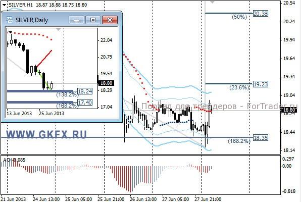Цены на серебро оставались на прежних уровнях и только сегодня утром немного обновили минимум среды. Традиционно делаю два варианта движения цены на неделю, основной красный и альтернативный зеленый. Значимые уровни на сегодня отмечены на часовом графике. Индикатор АО находится в отрицательной зоне и растет, указывая на коррекцию перед возможным продолжением снижения. Индикатор тренда указывает на снижение. Вне рынка.