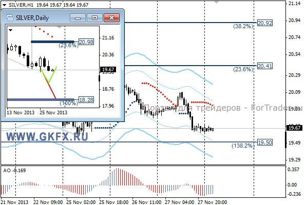 Цены на золото подтвердили свое нежелание продолжать рост и от отметки 1254,0 резко снизились вплоть до 1235,0. Расширяющаяся формация переросла в торговый диапазон, в котором цены на золото могут торговаться до конца недели, так как США ушли на длинные выходные. Давление на золото оказали сильные данные по США, которые направили доллар в рост. Есть также вариант снижения цен на золото еще ниже в район 1227,0. Традиционно делаю два варианта движения цены на неделю, основной красный и альтернативный зеленый. Значимые уровни на сегодня отмечены на часовом графике. Индикатор АО находится в отрицательной зоне и растет, указывая на коррекцию перед возможным продолжением снижения. Индикатор тренда указывает на снижение. Вне рынка.