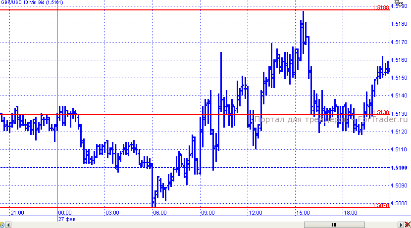 GBP/USD также делала неумелые попытки пробоя сопротивления 1,5160, однако максимумом 1,5187 дело и закончилось, после чего пара откатилась в район уровней открытия, где и завершила торги. Вышедшие выше прогнозов данные ВВП за 4 квартал во втором чтении не оказали особого влияния на рынок, что еще больше подтверждает неверие трейдеров в «светлое будущее» для Великобритании.