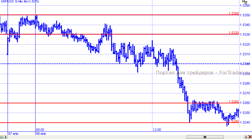 Фунт был более однозначен в своих движениях. Котировки, коснувшись уровня 1,5350, все же начали падение, в рамках которого преодолели несколько уровней поддержки, снова закрепившись ниже отметки 1,53. Минимум был отмечен в районе уровня 1,5240. Там же, котировки и завершили торговый день.