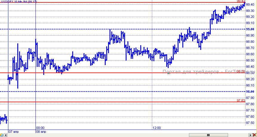 Пара доллар/иена новую неделю начала гэпом вверх. Довольно быстро цены достигли уровня 99,00, который на короткое время смог сдержать рост. Однако, в дальнейшем пара все же смогла преодолеть указанное сопротивление и продолжила рост к 99,43, где и завершила торговые сутки.