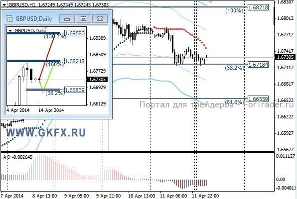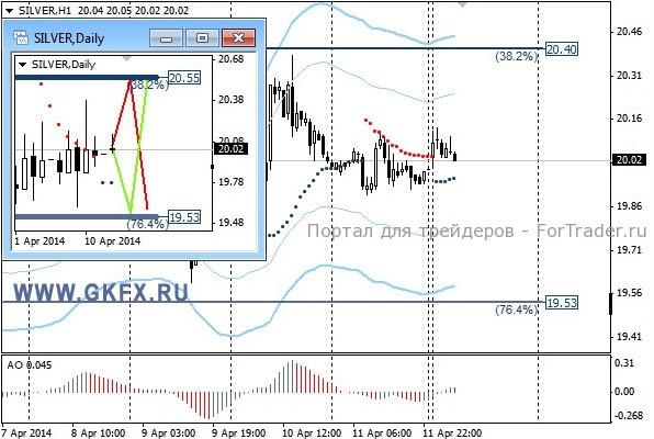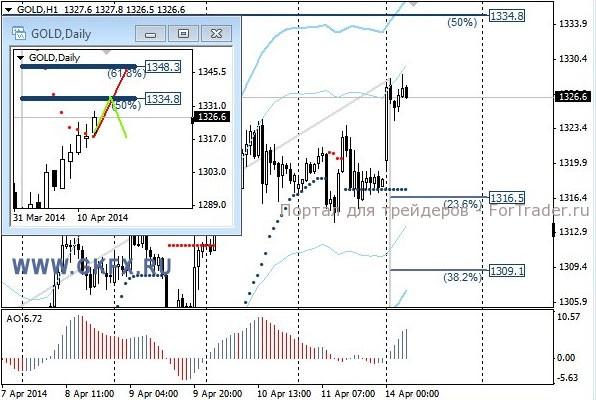 Цены на золото корректировали рост прошлой недели в пятницу незначительно, а это значит, что к дальнейшему росту все были готовы. Как можно видеть сутра, цены на золото продолжили рост к новым максимумам за три недели. Этому поспособствовали события в Украине. Сегодня новое правительство приказало применить силу против мирных жителей, что означает начало гражданской войны. Золото в такие периоды получает поддержку. Традиционно делаю два варианта движения цены на неделю, основной красный и альтернативный зеленый. Значимые уровни на сегодня отмечены на часовом графике. Индикатор АО находится в положительной зоне и снижается, указывая на коррекцию перед возможным продолжением роста. Индикатор тренда указывает на рост. Покупки от 1324,0 с целями 1328,0 и 1334,0. Стоп ниже 1321,0.