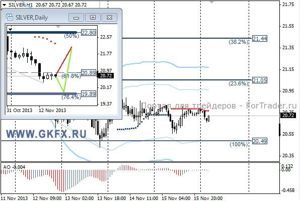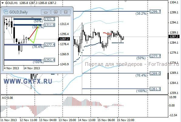 Цены на золото в пятницу установились в диапазоне, хотя ожидалось продолжение роста. Тем не менее рост золота на этой неделе очень вероятен, так как заместитель председателя ФРС США Джанет Йеллен приверженец продолжать стимулирование экономики. Джанет Йеллен главный претендент на пост председателя ФРС США в январе. Прошедшая неделя частично отработалась по красному сценарию. Традиционно делаю два варианта движения цены на неделю, основной красный и альтернативный зеленый. Значимые уровни на сегодня отмечены на часовом графике. Индикатор АО находится у нуля, указывая на неопределенность. Индикатор тренда указывает на рост. Преодоление 1290,0 даст возможность купить с целями 1300,0 и 1311,0.