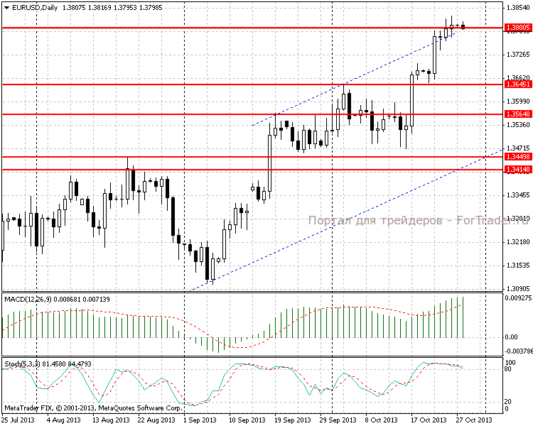 В ближайшие дни внимание участников рынка будет сосредоточено на заседание ФРС США, которое запланировано на 29-30 октября. По мнению большинства инвесторов, Федрезерв не будет сворачивать QE. На дневном графике видим растущий тренд. Цена консолидировалась вблизи линии восходящего канала и ключевого уровня 1,3800. Дневная MACD-гистограмма начинает замедлять рост. Линии стохастического осциллятора находятся в зоне перекупленности, что в свою очередь можно расценить как готовность рынка перейти в коррекционную фазу.