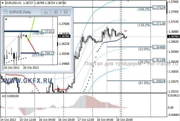 Пара EURUSD в пятницу выполнила еще один рывок вверх до отметки 1,3700 и отошла от достигнутых максимумов. Ожидаемой коррекции не произошло, настолько сильно желание купить. Сюрпризом стал календарь на эту неделю по США. Во вторник выйдет Nonfarm Payrolls, так что начало недели обещает быть веселым. Сегодня наверняка рынок начнет готовиться к этому событию и ожидается коррекция. Прошедшая неделя отработала зеленый сценарий. На эту неделю традиционно рассматриваю два варианта возможного движения цены, основной красный и альтернативный зеленый. Значимые уровни на сегодня отмечены на часовом графике. Индикатор АО находится у нуля, указывая на неопределенность. Индикатор тренда указывает на снижение. Наблюдаем за рынком.