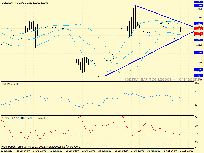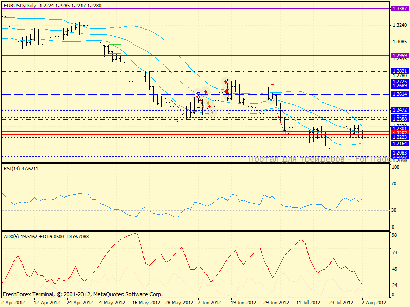 Дневной график: консолидация возле средней Боллинджера продолжается. Проходит достаточно активная проторговка евро, и пока многие мелкие трейдеры в легком недоумении — кто и куда набирает позиции.Мы же видим, что на движении вверх АДХ опускается, трактую рост как коррекцию (либо манипуляцию).В районе уровня 1.2301 находится и нисходящая верхняя Боллинджера (на данный момент на отметке 1.2320), поэтому оттуда вероятны новые продажи.
