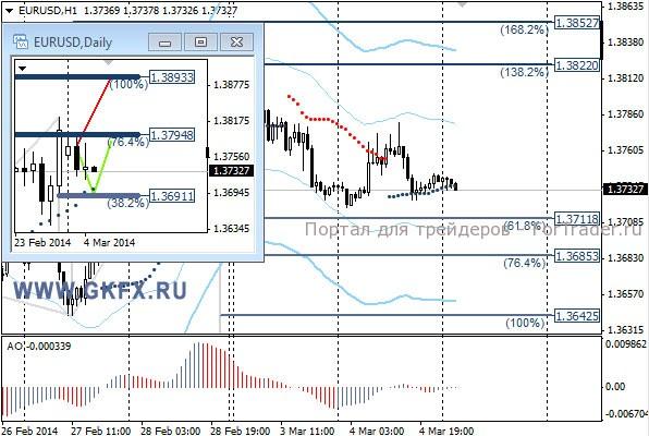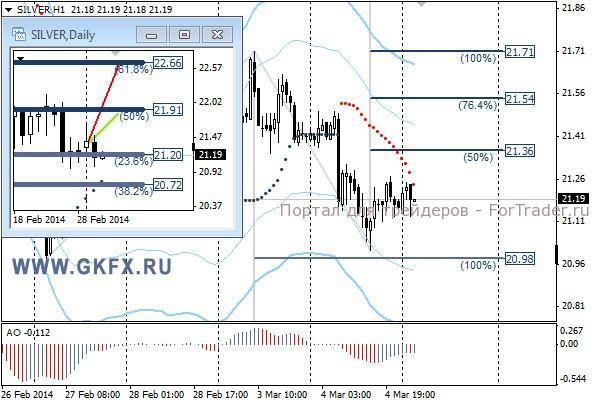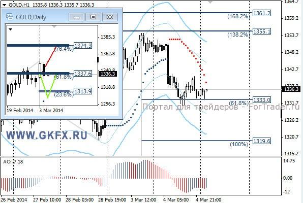 Цены на золото отошли от максимумов к уровням открытия недели на фоне ослабнувшей напряженности в ситуации с Украиной. Путин давая пресс-конференцию вчера, сказал, что задействование войск это самый крайний вариант. Это позволило инвесторам успокоиться и вернуться в нормальное русло. Фондовые рынки подросли, а золото снизилось, что свидетельствует о возвращении инвесторов обратно. На этом история не заканчивается, однако реакция на дальнейшие события в Украине может быть более сдержанной. Сделка в покупки исполнилась, стоп можно поставить за 1330,0. Традиционно делаю два варианта движения цены на неделю, основной красный и альтернативный зеленый. Значимые уровни на сегодня отмечены на часовом графике. Индикатор АО находится в отрицательной зоне и снижается, указывая на желание инструмента двигаться вниз в данное время. Индикатор тренда указывает на снижение. Держим покупки от 1341,0 с целями 1348,0, 1354,0 и 1360,0.