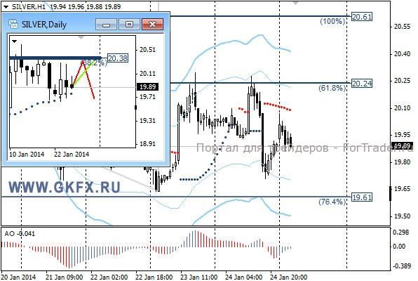 Цены на серебро ведут себя иначе, чем на золото и это настораживает. Цены установились в довольно широком диапазоне и не желают выходить за его границы, в то время как золото набирает силу. Очень подозрительно. На дневном графике не отработался не один из вариантов. Традиционно делаю два варианта движения цены на неделю, основной красный и альтернативный зеленый. Значимые уровни на сегодня отмечены на часовом графике. Индикатор АО находится в отрицательной зоне и растет, указывая на коррекцию перед возможным продолжением снижения. Индикатор тренда указывает на снижение. Сегодня наблюдаем за предпочтениями рынка.