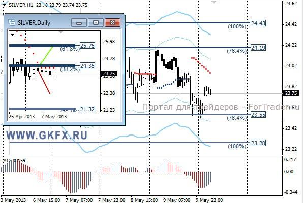 Цены на серебро также отошли от максимумов и направляются в сторону 23,25. По вчерашней рекомендации ордер не сработал. Традиционно делаю два варианта движения цены на неделю, основной красный и альтернативный зеленый. Значимые уровни на сегодня отмечены на часовом графике. Индикатор АО находится в отрицательной зоне и растет, указывая на коррекцию перед возможным дальнейшим снижением. Индикатор тренда указывает на снижение. Вне рынка.