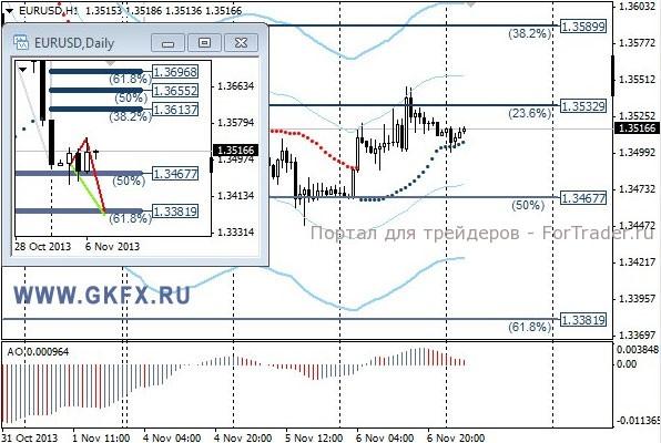 Пара EURUSD поднималась в течение дня на фоне позитивной статистики по Еврозоне. Участники рынка не желают до окончания заседания ЕЦБ выводить пару из диапазона. Ожидания похода вниз не оправдались. Теперь пара будет ожидать комментариев президента Драги после заседания ЕЦБ. Участники рынка будут ожидать намеков на возможное снижение процентных ставок в декабре, так как инфляция опустилась намного ниже целевого уровня. На эту неделю традиционно рассматриваю два варианта возможного движения цены, основной красный и альтернативный зеленый. Значимые уровни на сегодня отмечены на часовом графике. Индикатор АО находится в положительной зоне и снижается, указывая на коррекцию перед возможным продолжением роста. Индикатор тренда указывает на рост. Преодоление 1,3465 позволит войти в продажи с целями 1,3440, 1,3410 и 1,3385. Преодоление 1,3550 позволит войти в покупки с целью 1,3590.