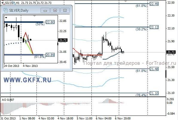Цены на серебро также не стали проходить поддержку, а напротив, двинулись в другую сторону. Традиционно делаю два варианта движения цены на неделю, основной красный и альтернативный зеленый. Значимые уровни на сегодня отмечены на часовом графике. Индикатор АО находится у нуля, указывая на неопределенность. Индикатор тренда указывает на рост. Рекомендацию оставляю прежней, она все еще актуальна. Преодоление 21,50/60 даст возможность для продаж с целью 21,10.