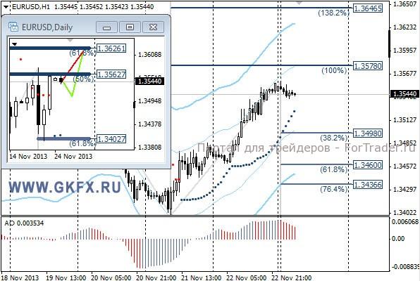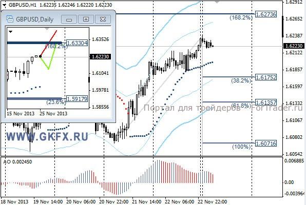 Пара GBPUSD также росла, вопреки моим ожиданиям. Как я уже отмечал выше, мое виденье рынка на прошедшей неделе отличалось от реальности. Если до четверга уровень 1,6260/70 не будет пройден, то позднее вряд ли это случится, так как ликвидность на рынке будет низкой в связи с праздниками в США. Прошедшая неделя отработала частично по зеленому сценарию. На этой неделе по традиции рассматриваю два варианта возможного движения цены, основной красный и альтернативный зеленый. Значимые уровни на сегодня отмечены на часовом графике. Индикатор АО находится в положительной зоне и снижается, указывая на коррекцию перед возможным продолжением роста. Индикатор тренда указывает на рост. Преодоление 1,6270 даст возможность для покупок с целями 1,6300 и 1,6330.