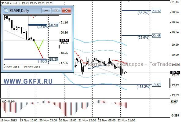 Цены на серебро торговались рядом с уровнем для исполнения продаж. По-прежнему все остается в силе. Прошедшая неделя не отработала не один из сценариев. Традиционно делаю два варианта движения цены на неделю, основной красный и альтернативный зеленый. Значимые уровни на сегодня отмечены на часовом графике Индикатор АО находится в отрицательной зоне и снижается, указывая на желание инструмента двигаться вниз в данное время. Индикатор тренда указывает на снижение. Преодоление 19,70 позволит войти в продажи с целями 19,50 и 18,90.