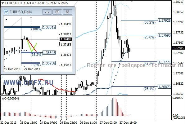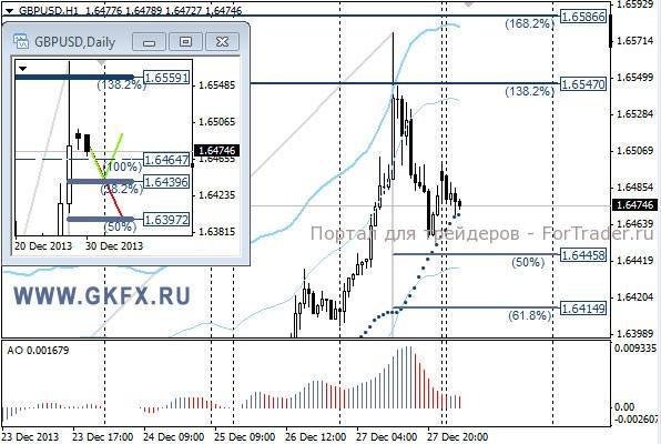 Пара EURUSD неожиданно выросла на маневрах еще тонкого рынка в праздничный период. Рост состоялся, так как были сорваны стопы и на этом рынок хорошо прокатился. Такие движения характерны для праздников, но непредсказуемы, поэтому рекомендаций в это время не даю. Рост ожидался, но не такой сильный. Рынок не отработал не один из отмеченных сценариев на прошлой неделе. На эту неделю традиционно рассматриваю два варианта возможного движения цены, основной красный и альтернативный зеленый. Значимые уровни на сегодня отмечены на часовом графике. Индикатор АО находится у нуля, указывая на неопределенность. Индикатор тренда указывает на рост. Вне рынка.