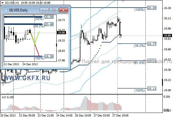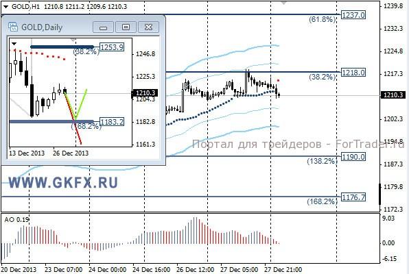 Цены на золото в пятницу незначительно изменялись в цене, хотя некоторый рост наблюдался. Участники рынка не предпринимают активных действий, в отличие от валютного рынка. На этой неделе думаю, динамика будет схожей в связи с предстоящим новым годом. Рынок не отработал не один из отмеченных сценариев на прошлой неделе. Традиционно делаю два варианта движения цены на неделю, основной красный и альтернативный зеленый. Значимые уровни на сегодня отмечены на часовом графике. Индикатор АО находится у нуля, указывая на неопределенность. Индикатор тренда указывает на снижение. Вне рынка.