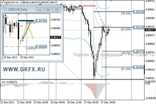 Пара USDCHF, как и евро, после значительного похода вниз вернула большую часть позиций. По паре также отмечается срывание стопов. Рынок не отработал не один из отмеченных сценариев на прошлой неделе. На эту неделю традиционно рассматриваю два варианта возможного движения цены, основной красный и альтернативный зеленый. Значимые уровни на сегодня отмечены на часовом графике. Индикатор АО находится у нуля, указывая на неопределенность. Индикатор тренда указывает на снижение. Вне рынка.