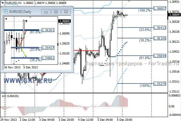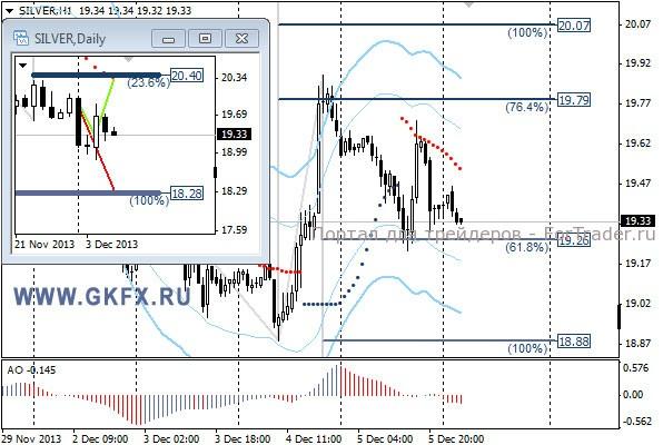 Цены на золото вновь подверглись влиянию смены настроений в отношении ожиданий сокращения программы QE3. Вчера сильные данные по США опять заставили участников рынка считать, что сокращение программы стимулирования экономики США возможно на этом заседании, так как ВВП США оказался значительно выше ожиданий, а число заявок на пособия по безработице резко сократилось, удивив рынок. Сегодняшние данные по рынку труда в США могут поставить точку во мнении большинства. Традиционно делаю два варианта движения цены на неделю, основной красный и альтернативный зеленый. Значимые уровни на сегодня отмечены на часовом графике. Индикатор АО находится в отрицательной зоне и растет, указывая на коррекцию перед возможным продолжением снижения. Индикатор тренда указывает на снижение. Под сегодняшние данные по США рекомендаций не даю. Вне рынка.