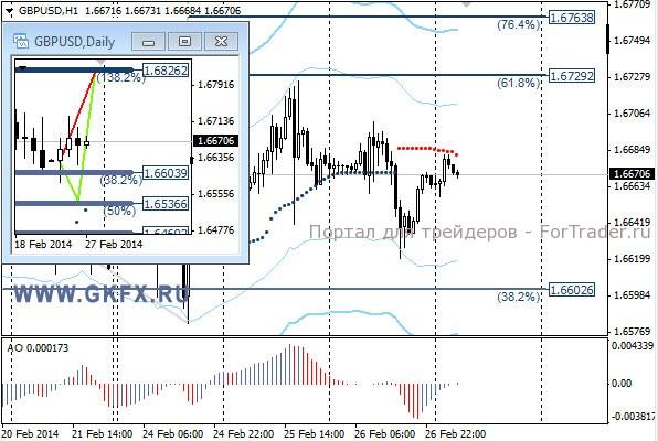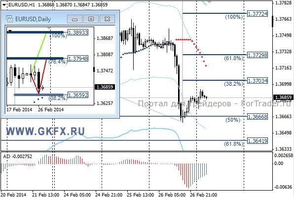 Пара EURUSD торговалась с понижением, среагировав на события связанные с Украиной. Президент России Путин призвал провести масштабные военные учения по всей стране и в том числе у границы с Украиной. За неимением других поводов рынок среагировал на это значительным понижением пары, так как инвесторы забеспокоились. Через Украину проходит газовая труба, которая снабжает часть Европы, и перебои в снабжении могут нанести существенный вред Европейской экономики. Далее снижение пары усилилось на неожиданно сильных данных по рынку жилья в США. Пока пара движется по красному сценарию и можно сегодня поискать покупки. На эту неделю традиционно рассматриваю два варианта возможного движения цены, основной красный и альтернативный зеленый. Значимые уровни на сегодня отмечены на часовом графике. Индикатор АО находится в отрицательной зоне и растет, указывая на коррекцию перед возможным продолжением снижения. Индикатор тренда указывает на снижение. Преодоление 1,3700 даст возможность купить с целями 1,3725 и 1,3770.