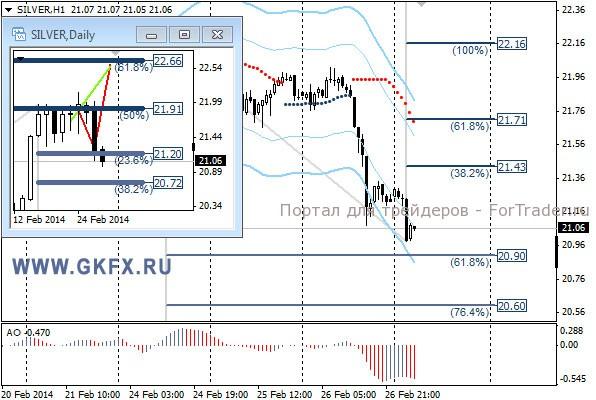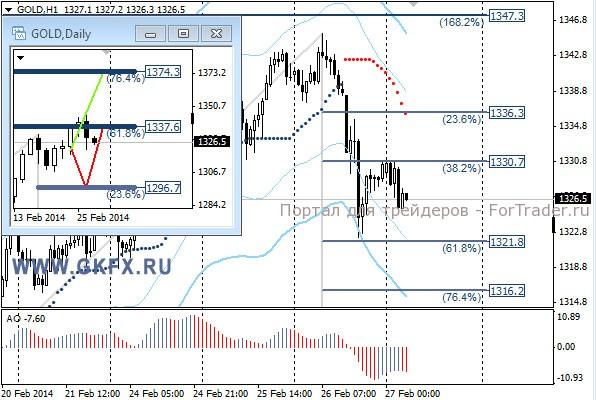 Цены на золото направились вниз после ряда событий спровоцировавших значительный рост доллара. Первое это массовые военные учения в России возле границы с Украиной. Второе это неожиданно сильные данные по рынку жилья в США. После ряда слабых показателей по рынку жилья в США, которые свидетельствовали о некотором охлаждении сектора, внезапно рост возобновился с новой силой. По рекомендации преодоление уровня 1343,0 было на мелких графиках, но на часовом таймфрейме подтверждения не последовало. Традиционно делаю два варианта движения цены на неделю, основной красный и альтернативный зеленый. Значимые уровни на сегодня отмечены на часовом графике. Индикатор АО находится в отрицательной зоне и снижается, указывая на желание золота двигаться вниз в данное время. Индикатор тренда указывает на снижение. Вне рынка.