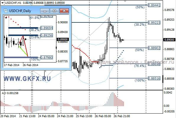 Пара USDCHF выросла с опозданием на день, так как я ожидал подобного роста еще вчера. Естественно сделка по рекомендации не исполнилась. Сегодня попытаемся продать с других уровней. На эту неделю традиционно рассматриваю два варианта возможного движения цены, основной красный и альтернативный зеленый. Значимые уровни на сегодня отмечены на часовом графике. Индикатор АО находится в положительной зоне и снижается, указывая на коррекцию перед возможным продолжением роста. Индикатор тренда указывает на рост. Преодоление 0,8890 даст возможность продать с целями 0,8870 и 0,8855.