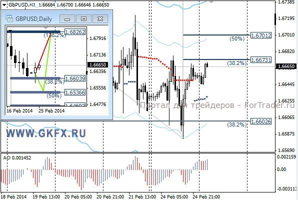 Пара GBPUSD продолжила торговаться разнонаправлено в рамках коррекции. Сегодня ключевым будет уровень 1,6675, преодоление которого направит пару вверх на какое-то время. На этой неделе по традиции рассматриваю два варианта возможного движения цены, основной красный и альтернативный зеленый. Значимые уровни на сегодня отмечены на часовом графике. Индикатор АО находится в положительной зоне и снижается, указывая на коррекцию перед возможным продолжением роста. Индикатор тренда указывает на рост. Преодоление 1,6675 даст возможность купить с целями 1,6700, 1,6725 и 1,6740.